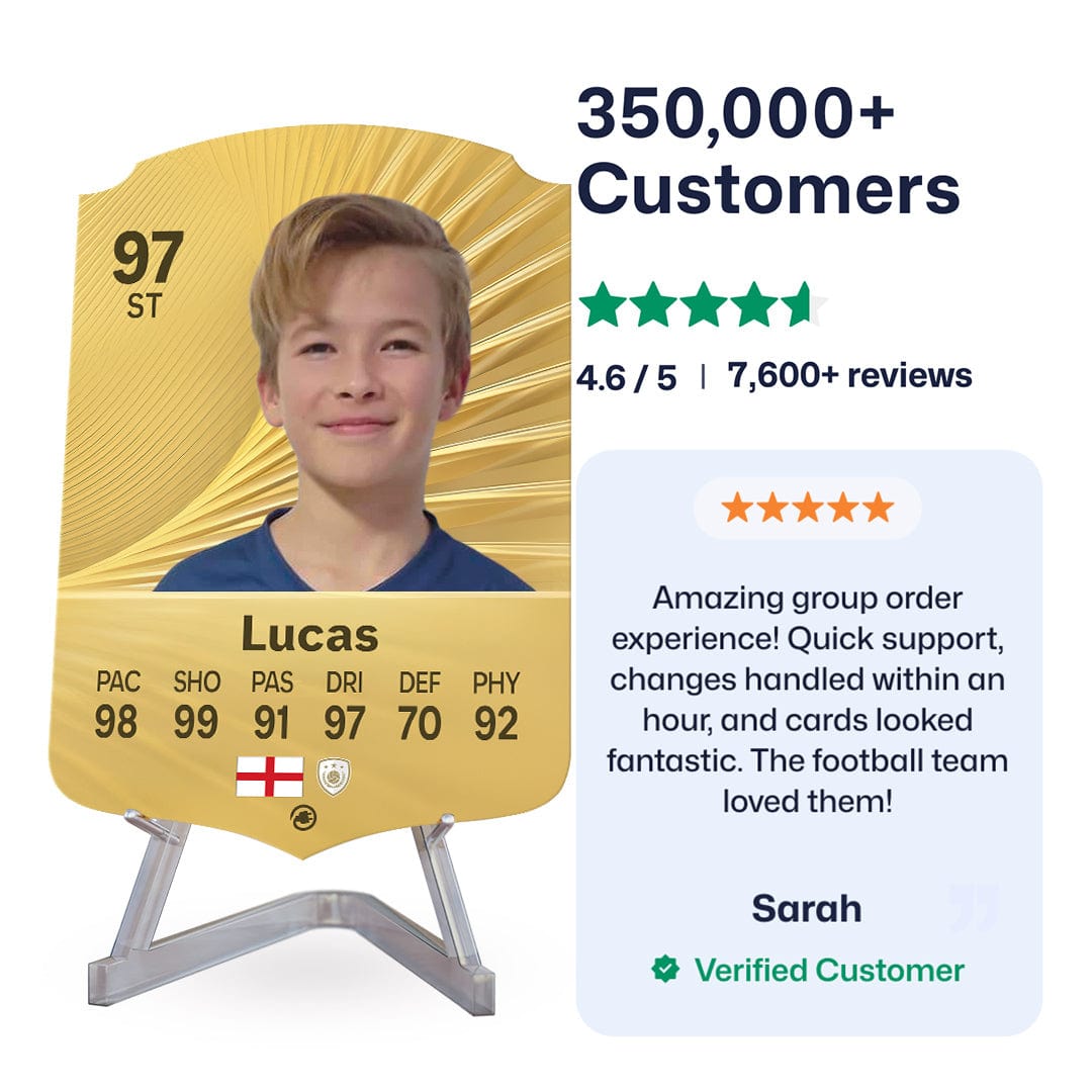 Once you’ve personalised your card, our design experts will edit your photo, design your card, and bring it to life in stunning quality. You’ll get a full preview before we print your card and every card’s quality is backed by our Gold Standard Guarantee. So far, over 350,000+ football fans agree: A CardsPlug football card is the ultimate football gift!
