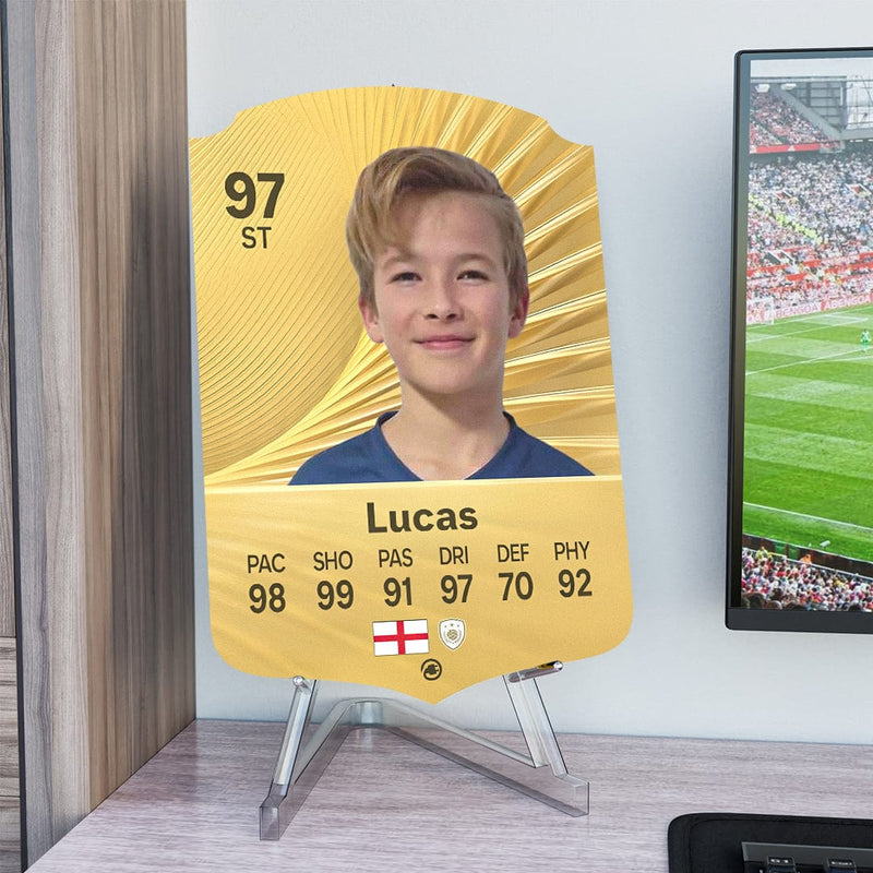 When it comes to personalising your card, the basic steps are to upload a photo and add a name to your card. Then you’ll add details like your player’s position and skill ratings out of 99 for each football skill shown on the card. Our online card builder makes this really easy. And if you aren’t a football card expert, don’t worry!
