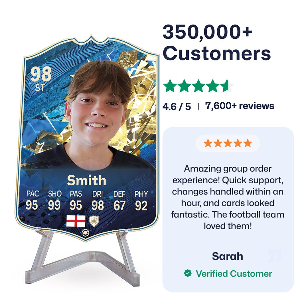 Once you’ve personalised your card, our design experts will edit your photo, design your card, and bring it to life in stunning quality. You’ll get a full preview before we print your card and every card’s quality is backed by our Gold Standard Guarantee. So far, over 350,000+ football fans agree: A CardsPlug football card is the ultimate football gift!