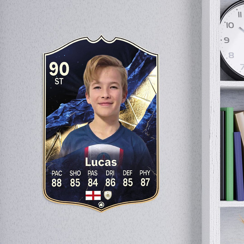 When it comes to personalising your card, the basic steps are to upload a photo and add a name to your card. Then you’ll add details like your player’s position and skill ratings out of 99 for each football skill shown on the card. Our online card builder makes this really easy. And if you aren’t a football card expert, don’t worry!